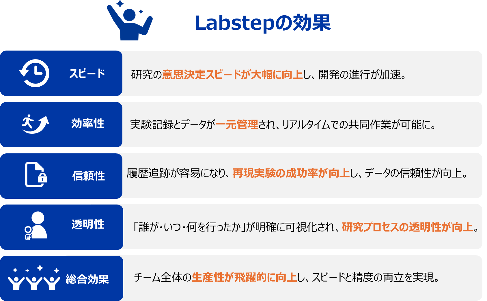 Labstepを導入することで、実験記録とデータの一元管理が実現し、チーム内の情報共有が劇的にスムーズになりました。以前は記録内容の確認や、修正版の取りまとめに1日以上を要することもありました。Labstepの導入により、リアルタイムでの記録閲覧・修正が可能となり、研究の意思決定スピードが大幅に向上。また、作業履歴が明確になることで再現性が高まり、データの信頼性が向上します。これにより、研究プロセスの透明化とチーム全体の生産性・再利用性が飛躍的に高まり、研究開発のスピードと精度の両立を実現します。