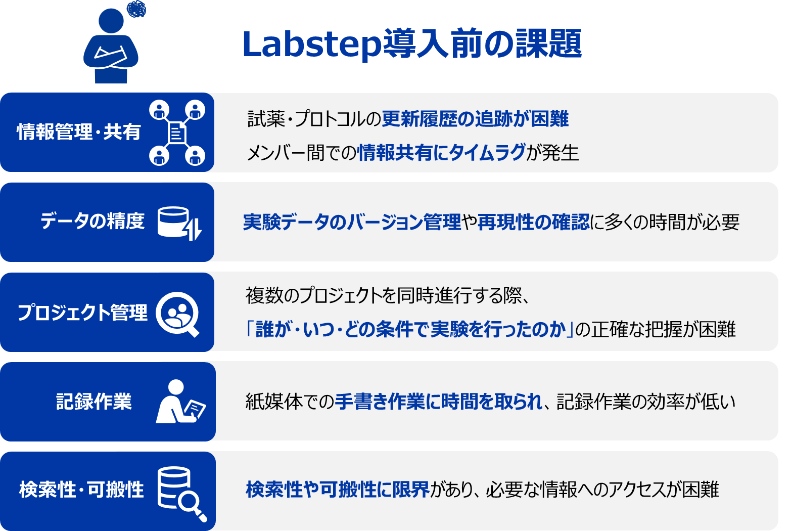 Labstep導入以前は、主に紙ベースやExcelで実験記録を管理していましたが、その運用の中で研究の効率化を妨げるいくつかの深刻な課題が明らかになっていました。これらの課題は、日々の研究活動において時間的コストと精度の低下を引き起こしていました。
