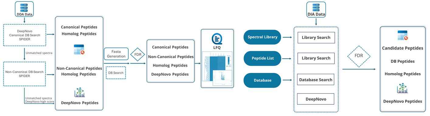 ペプチドミクスデータセットを用いて、最新のGraphNovoディープラーニングシーケンシングアルゴリズムが使われており、ペプチド同定の感度と精度の大幅な向上が期待され、より正確なFalse Discovery rateの推定が可能になります。