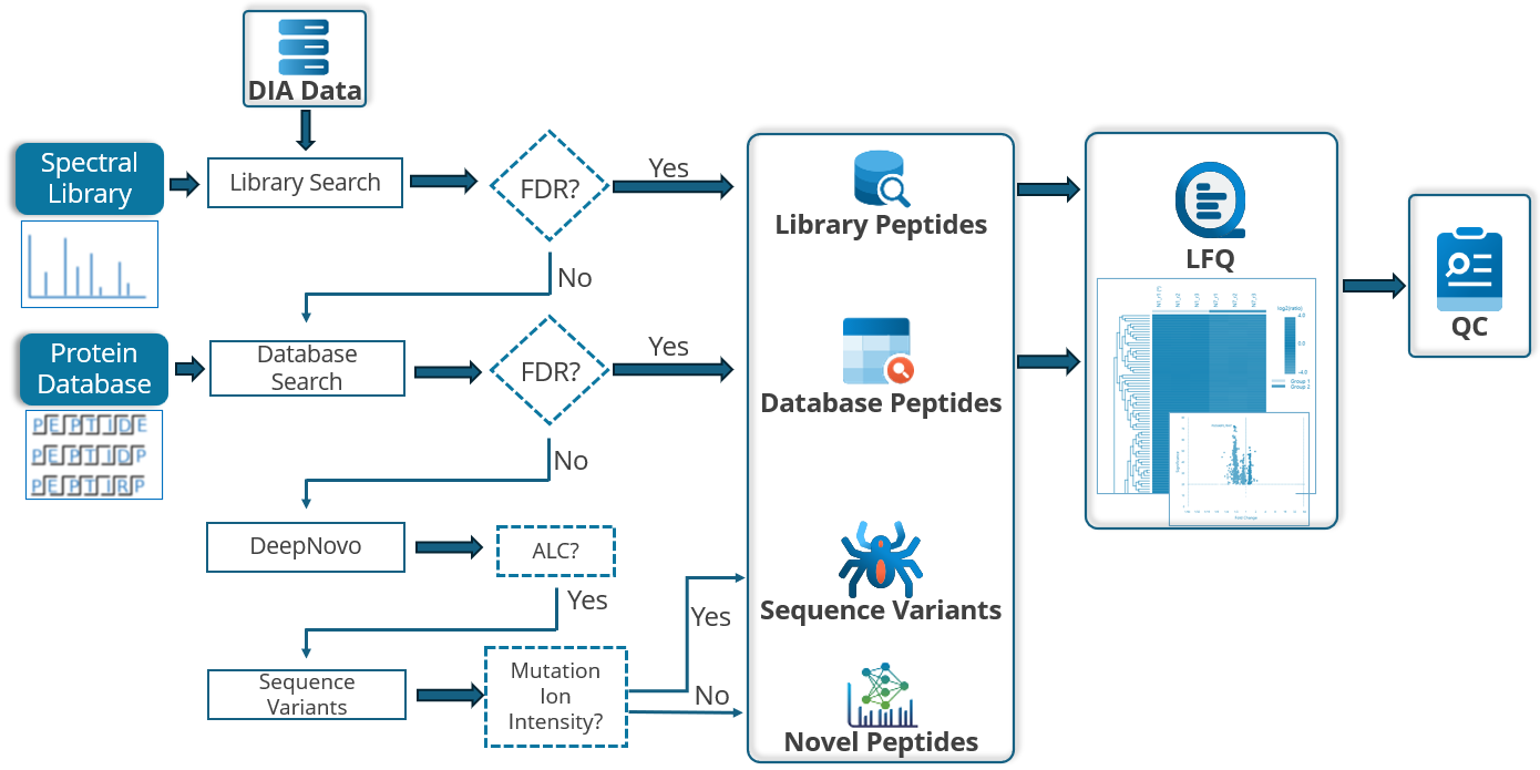 MS/MSスペクトル(前のステップでスペクトルライブラリが使用された場合、スペクトルライブラリにマッチしなかったものも含む)は、in silicoで消化され予測されたタンパク質配列データベースに対して検索されます。